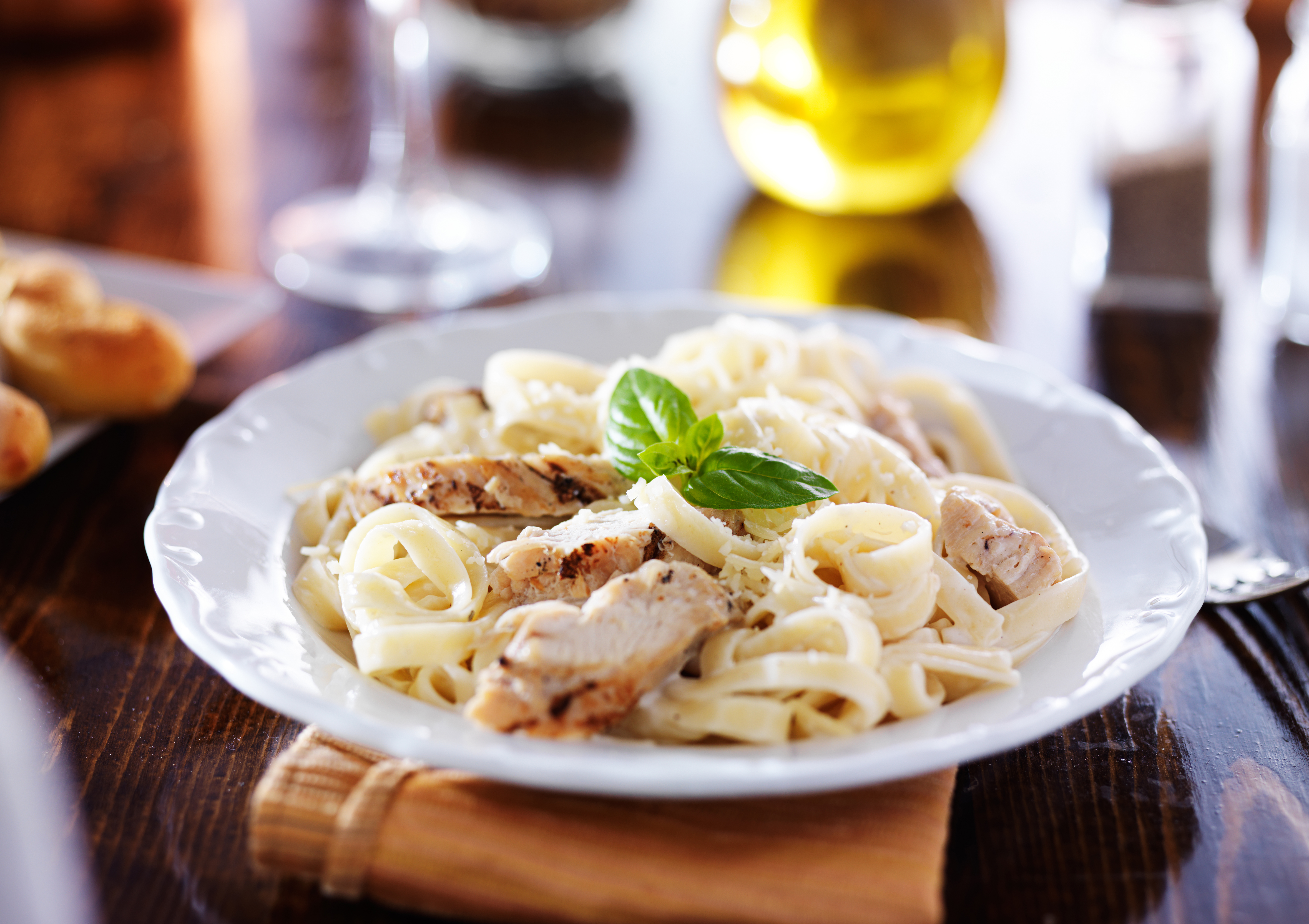 Delicious dishes of house-made meatballs in marinara sauce over penne pasta & fettuccine Alfredo, served with Caesar salad and garlic bread.